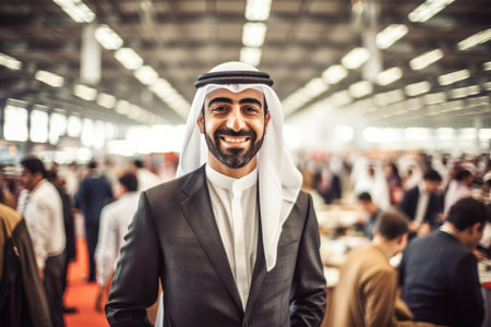 A shot of an Arab businessman at a global trade fair, showing the impact of Arab businesses on the international market. Generative Ai