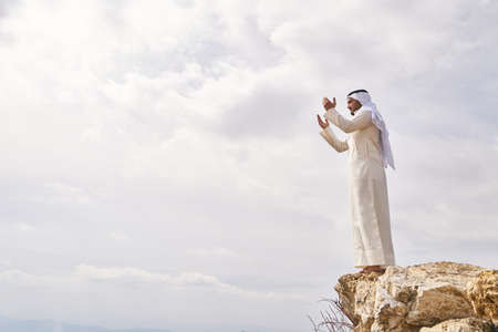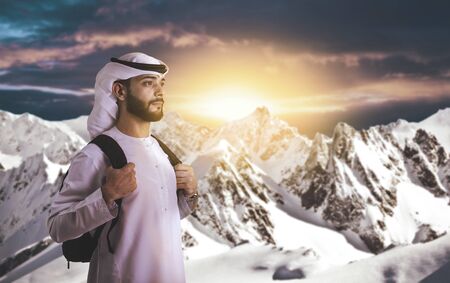 Arab man climbing mountain for new challenge - ambition and hopefulness concept