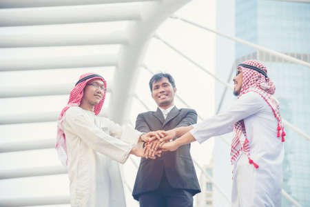 Arab team hold digital tablet uae union teamwork people. Digital marketing arab group of people using smart tablet discuss modern muslim UAE city. Entrepreneur Asian people smile teams meeting.