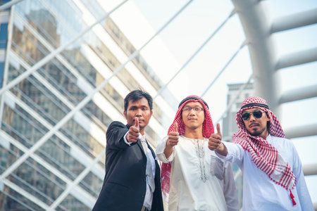 Handsome modern Arabian man standing in modern city wear muslim dress headscarf eastern ethnic smile outside office. Arab Man looking plan new project while walking in big city. Business successful