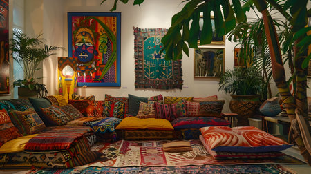 This eclectic bohemian living space bursts with maximalist style, featuring an array of colorful cushions, intricate wallhangings, and lush green plants. Vibrant modern art paintings and traditional