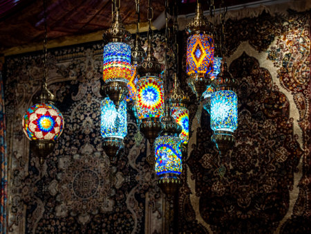 Traditional bright decorative hanging Turkish lamps and colourful lights with vivid colours in the Istanbul Bazaar,