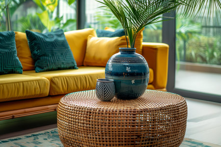 decorative vase on a wooden round rattan coffee table near a yellow sofa