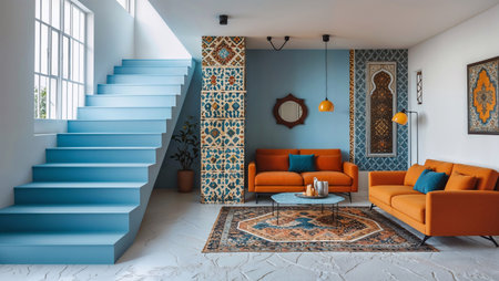 Stylish living room with a blue staircase, orange sofas, and Mediterranean decor, featuring windows and ornate tiles on a white interior