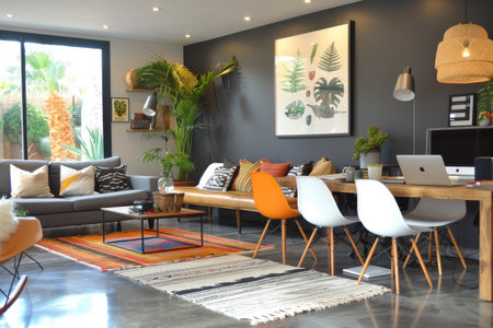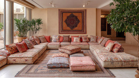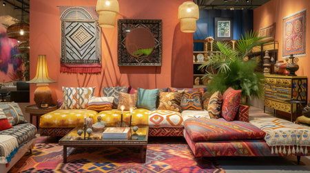 Stylish modern living room with bohemian decor and comfortable seating arrangement