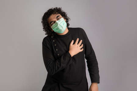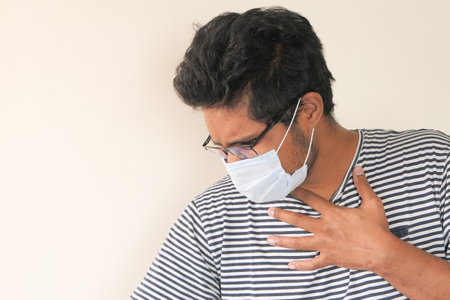 man having a fever wearing a medical mask feeling sick and ill.
