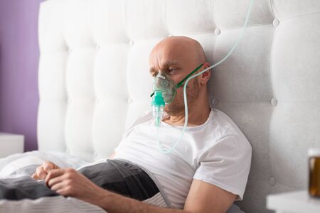 Man breathing through oxygen mask in bed. Covid-19 patient.