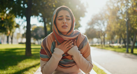 Young muslim woman in hijab experiencing discomfort while sitting in sunlit park