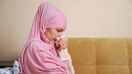 Young woman in hijab sneezes and suffers from runny nose on sofa.