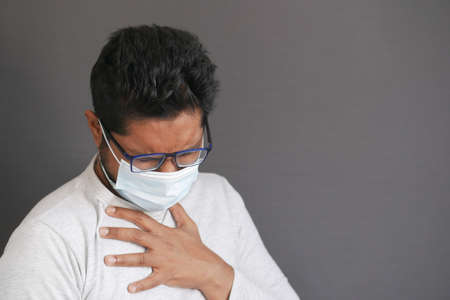 Sick Asian man wearing a medical face mask and Coughing and covering his mouth with my hand. Concept of protection pandemic coronavirus and respiratory disease
