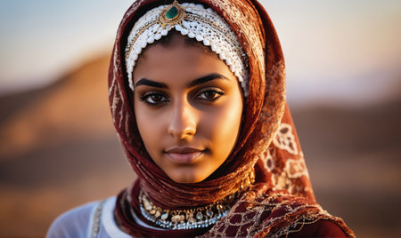 A young woman wearing a hijab and traditional jewelry looks directly at the camera in a desert landscape