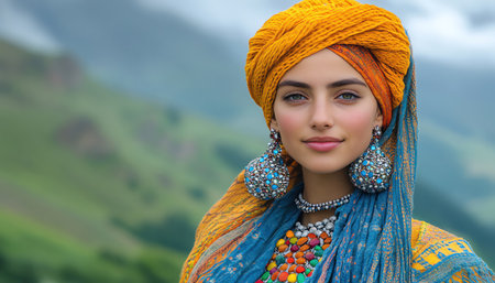 Elegant woman in traditional attire and jewelry, standing against a scenic mountain backdrop