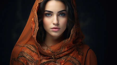 Studio shot of a young charming woman wearing the terracotta hijab decorated with sequins and jewelry. Arabic style.