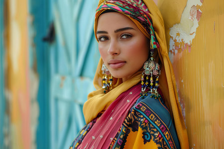 Young middle eastern woman with colorful makeup and traditional clothing posing in front of a vibrant blue and yellow wall