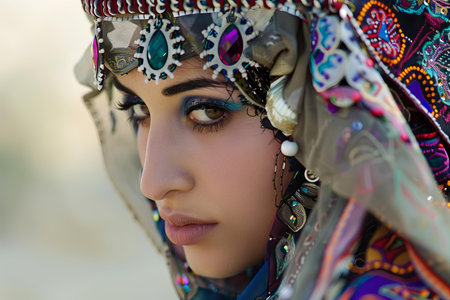 Close up portrait of a beautiful eastern woman with bright makeup and jewelry wearing headscarf.