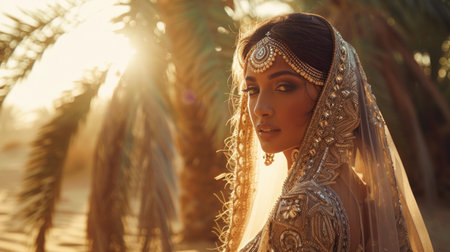 A bride in bedouin-inspired wedding attire, adorned with intricate, handcrafted jewelry and a flowing, sand-toned gown, standing gracefully in a desert oasis
