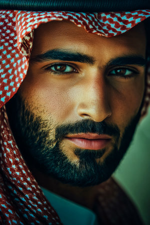 Portrait of a Middle Eastern man in close-up, wearing traditional attire, with a calm and confident expression.