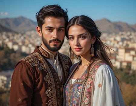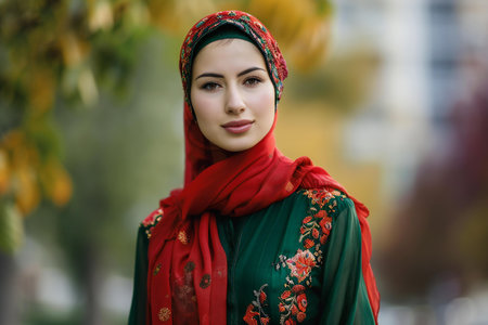 A young woman in vibrant Chechen clothing beams with warmth. Detailed embroidery adorns her dress, capturing cultural heritage. Her serene expression reflects pride and grace.