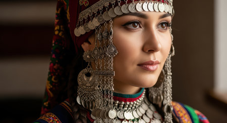 A woman adorned in vibrant traditional attire features elaborate jewelry with coins and beads. The detailed craftsmanship highlights heritage during a cultural celebration.
