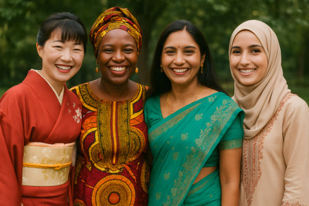 Four women from different cultures and ethnicities are smiling together in traditional clothing, representing global unity and diversity