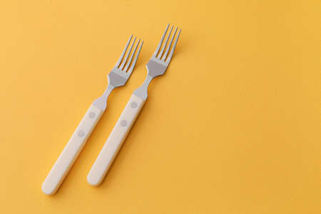 White and black plastic forks on a yellow background. The global problem of environmental pollution. Copy space. flat lay minimalism