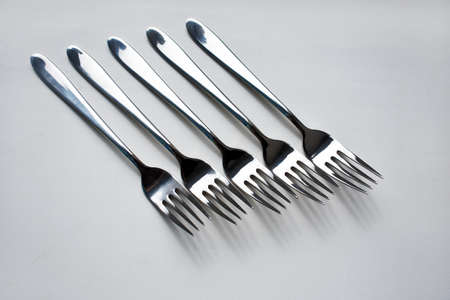 Five elegant table forks laid out in a flower shape isolated on white surface