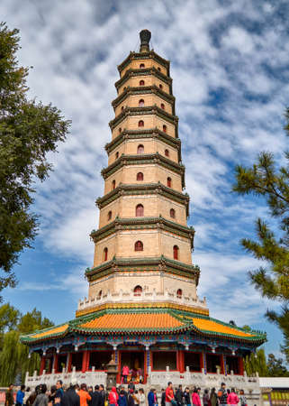 Chengde / China - October 3, 2014: Tourist visit Glazed octagonal Pagoda at Xumifushou Temple in Chengde Mountain resort, Chengde, Hebei province, Qing imperial summer residence in north China