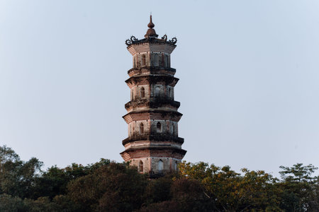 Ancient stone pagoda standing tall amidst green trees under clear sky