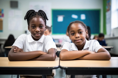 shot of two young students sitting at a desk in a classroom, created with generative ai