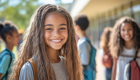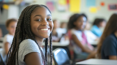 Caucasian girl smiling with confidence in classroom.