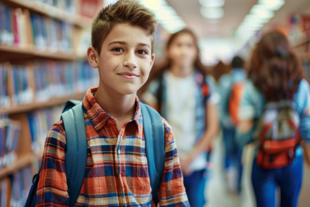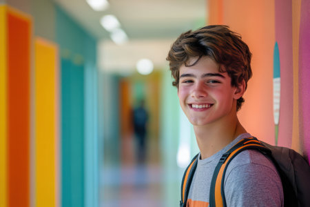 Happy teen boy stands in colorful school hallway with backpack, showing confidence, youthfulness, and school life.