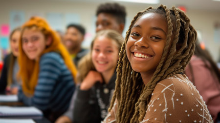 A diverse group of teenagers smiling and sitting in a classroom, ready to learn, the room filled with youthful energy and curiosity.