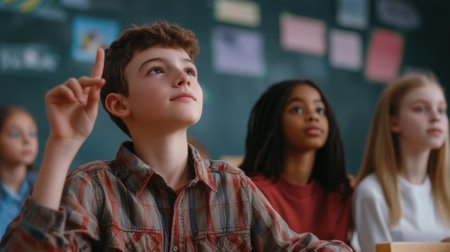 A boy pointing up with his hand in class while other students look on, AI