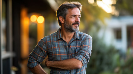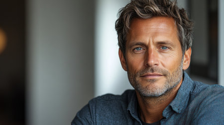 A mature man shares a reflective moment with a calm and confident demeanor.