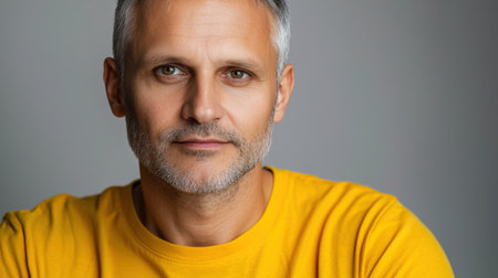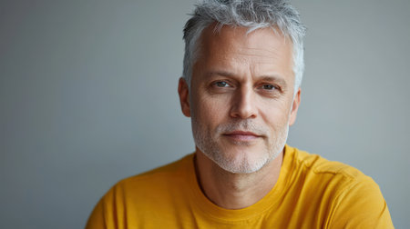 Close up of mature man with white skin, grey short hair, wavy hair and a clear yellow t shirt, isolated in a light grey studio. Portrait person