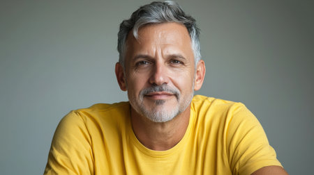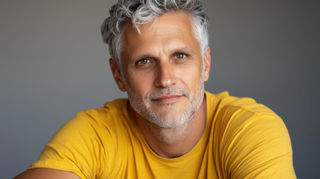 A middle-aged man with silver-streaked hair enjoys a moment of happiness, smiling in a bright yellow sweater. The contrasting dark background enhances his cheerful expression and relaxed demeanor.