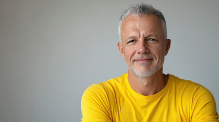 A man with a yellow shirt and gray hair is smiling. He looks happy and confident. Concept of warmth and positivity