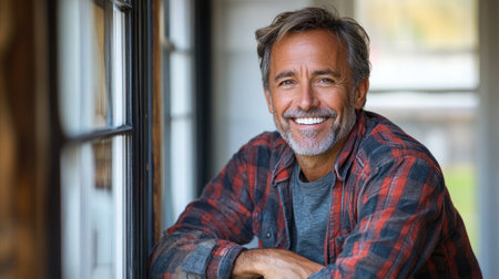 A mature man with gray hair and a beard sits calmly by a window, exuding warmth and kindness. His relaxed expression suggests contentment and inviting energy in a cozy environment.