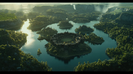 This stunning aerial view captures ancient ruins nestled among tranquil waters and lush greenery, creating a serene landscape ideal for nature and culture enthusiasts.