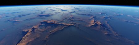 Earth horizon photo from outer space on a black background, The Libyan Desert on a closeup planet earth image, wide high resolution horizontal photo of world.