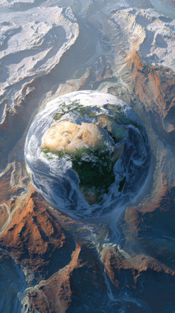 An artistic depiction presents the Earth globe set against a backdrop of mountainous terrain. The image features a blend of blues, greens, and browns, showcasing detailed textures. The overall composition suggests a sense of scale and offers potential applications in educational, scientific, or conceptual projects.