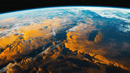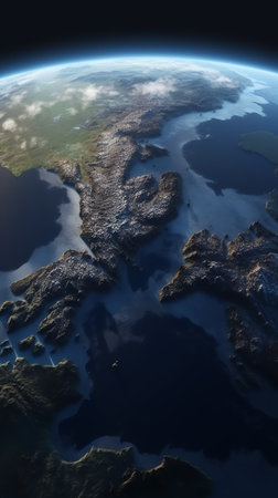 This stunning image captures a vibrant aerial view of Earth's surface from space, highlighting a sun-drenched landscape, vast ocean expansions, and wispy clouds, illustrating the planet's grandeur and beauty from the cosmos, AI generated image