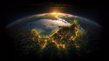 An AI generated illustration of a dazzling night-time landscape featuring the Earth's surface illuminated by a brilliant array of light sources