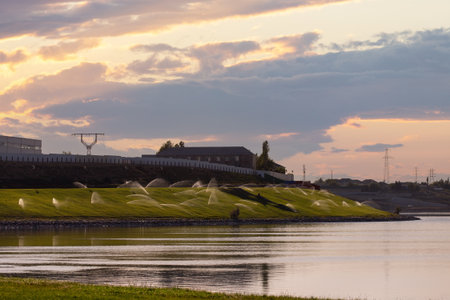 Baku. Azerbaijan. 05.31.2021. Watering the laws in Boyuk Shore Park at sunset.