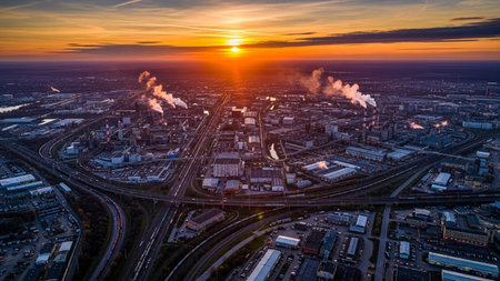 Sunset over a vast industrial complex, with silhouettes of factories, warehouses, and cooling towers against a dramatic sky, AI Generated