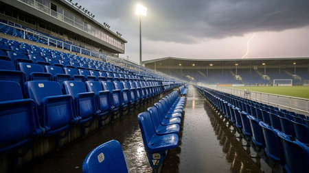 Rows of empty blue stadium seats are wet with rain droplets under a cloudy sky, reflecting the overcast weather.