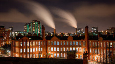 A captivating night view showcasing a blend of industrial heritage and modern living, featuring steam rising from historic factory chimneys in Manchester.