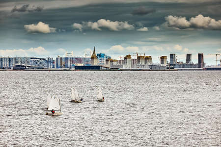 Russia, St. Petersburg, 17 June 2022: The residential complex under construction on the embankment of the Neva River on Vasilievsky island in sunny day, construction cranes, sailing yachts