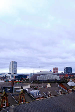 LEEDS, UNITED KINGDOM - Jan 11, 2020: Vertical shot of leeds skyline looking over the market roofs over towards the Corn Exchange roof