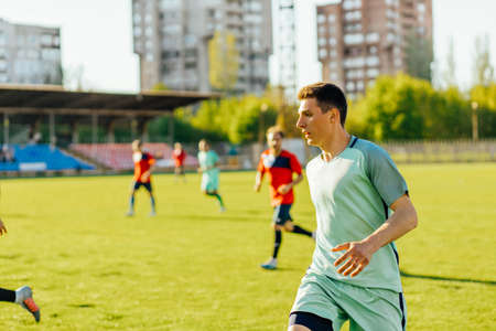 Field player forward with a ball in the center football field. Children's football, sport.